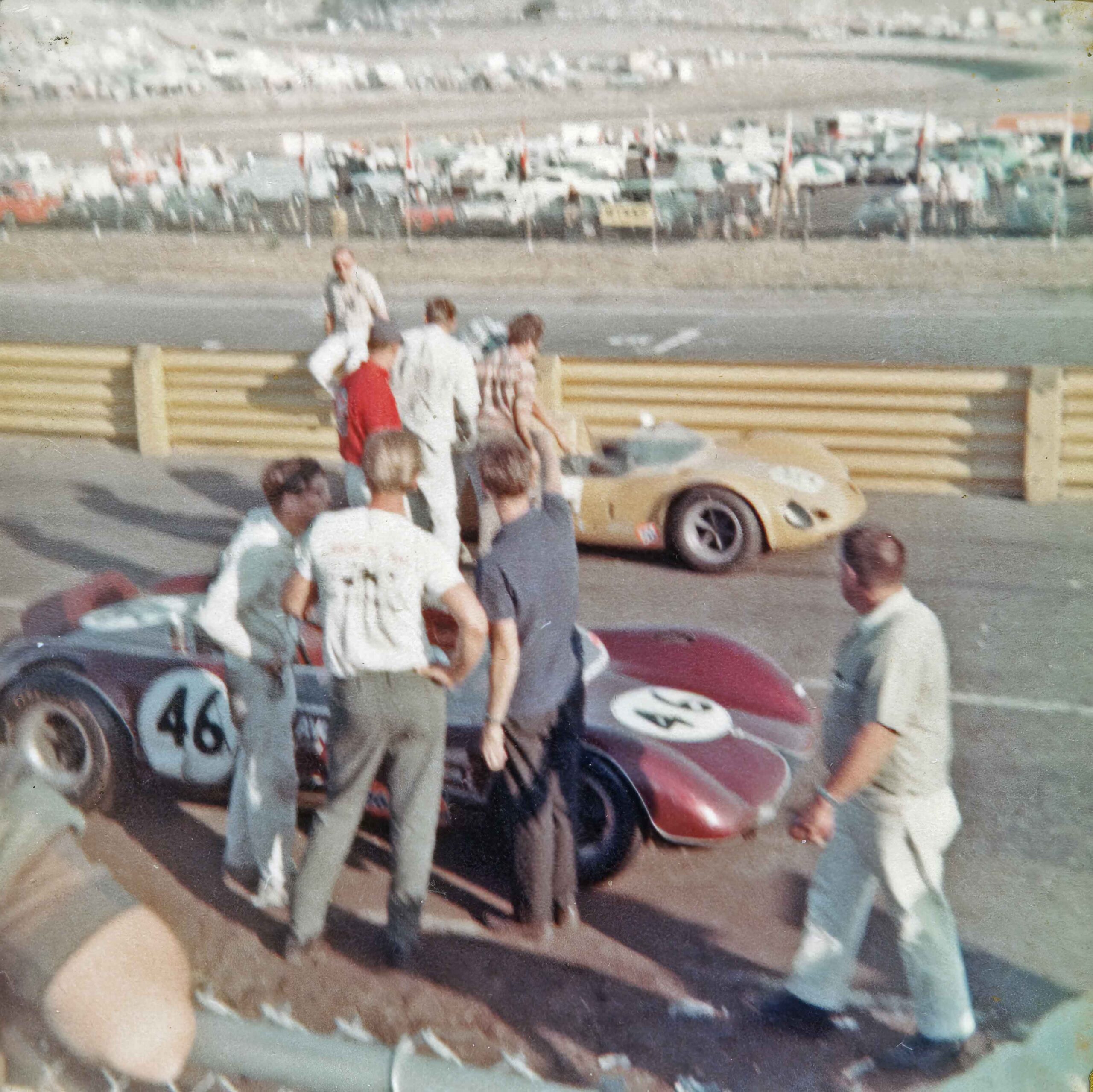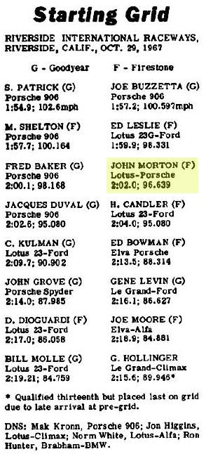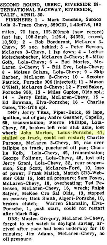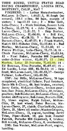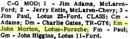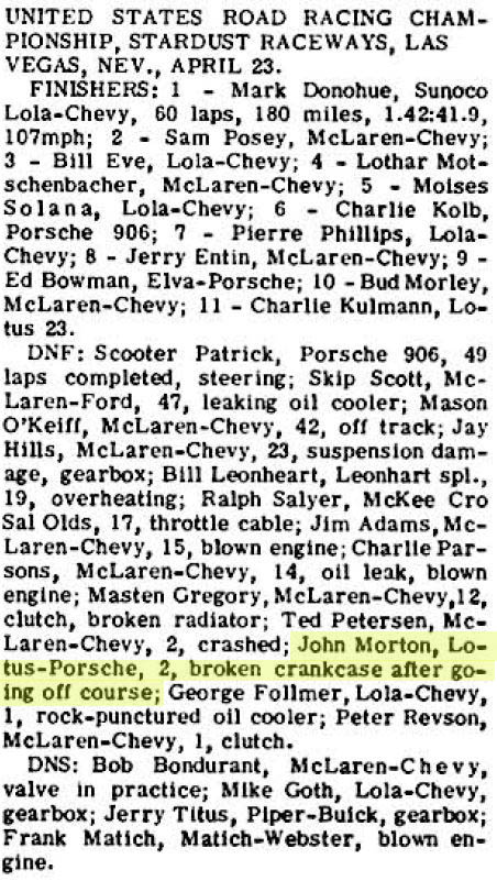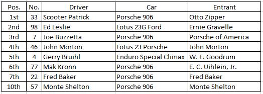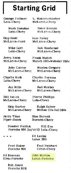 “John Morton’s Lotus 23-Porsche sixth. Morton had been running a strong fifth early in the race until losing several positions due to a pit stop to remove a broken exhaust megaphone.”