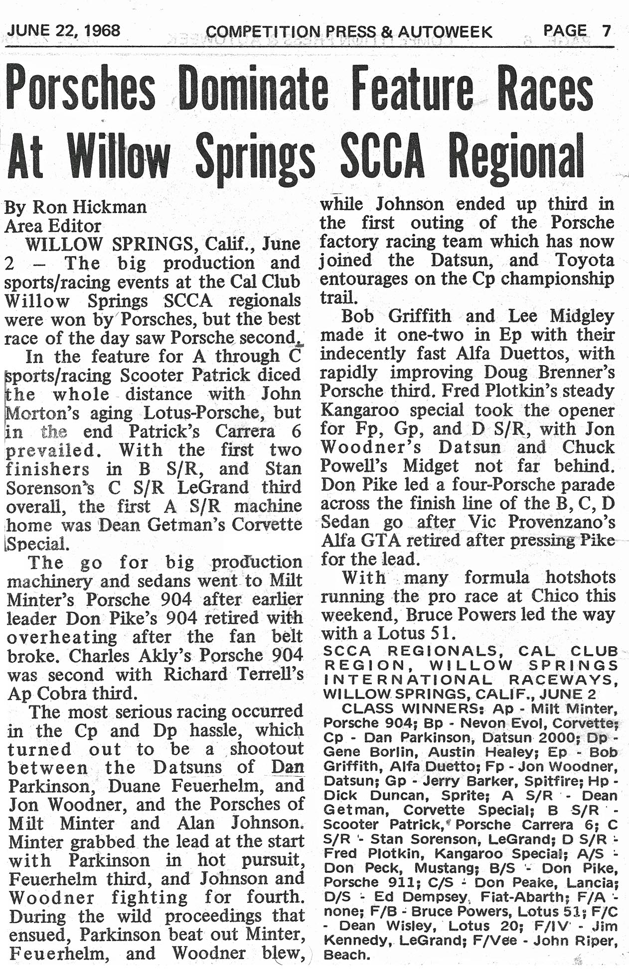“The car ran as well as it ever had, thanks to George (Boskoff), but I could only manage fourth after a race long battle with a Brabham BT 8 Climax. The three cars that beat me were Scooter in the 910 H Porsche and Lew Florence and Don Pike, both in 906 Porsches. This was the last time I would race the Lotus Porsche.”