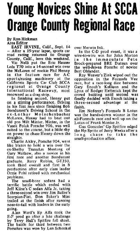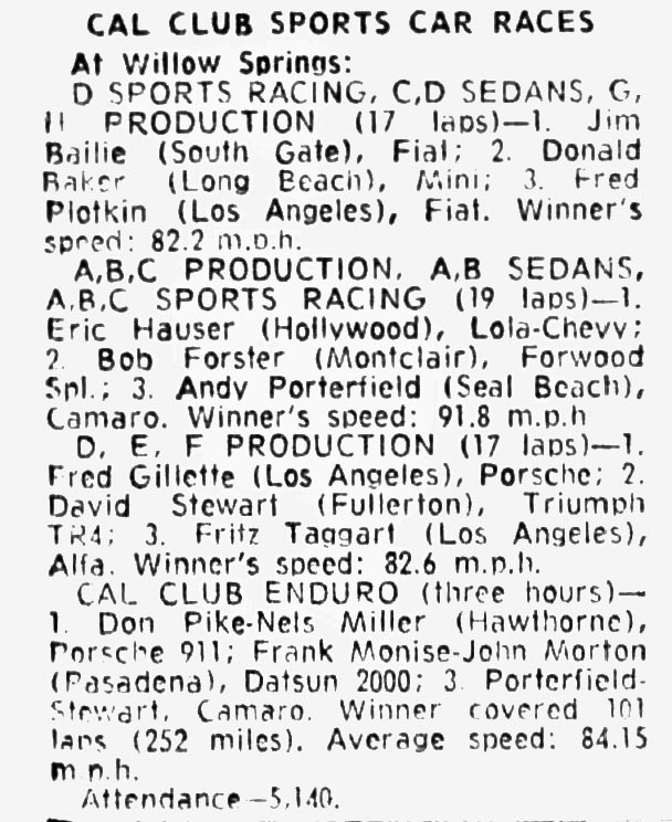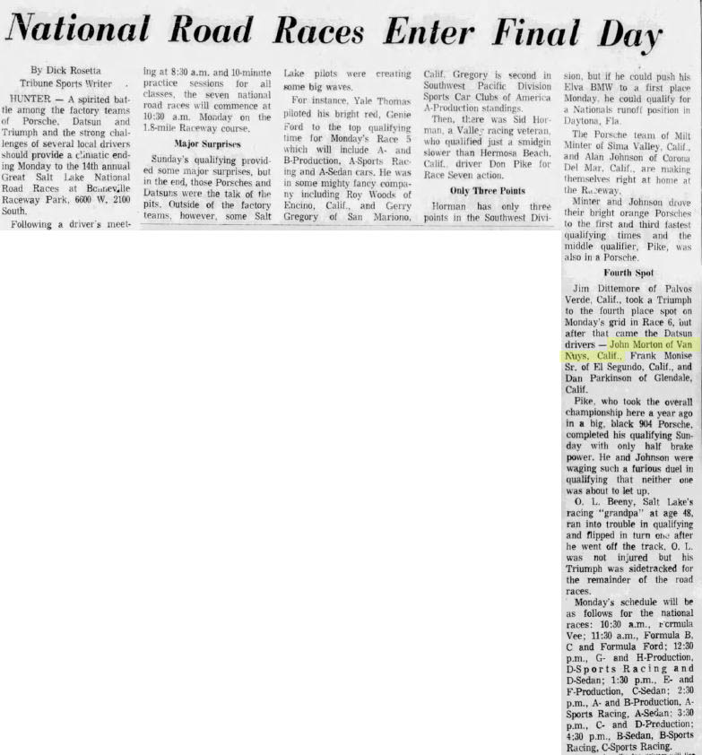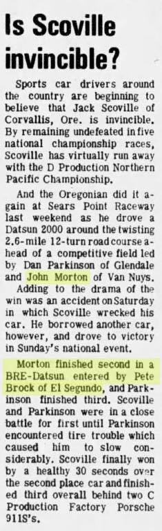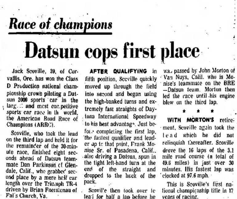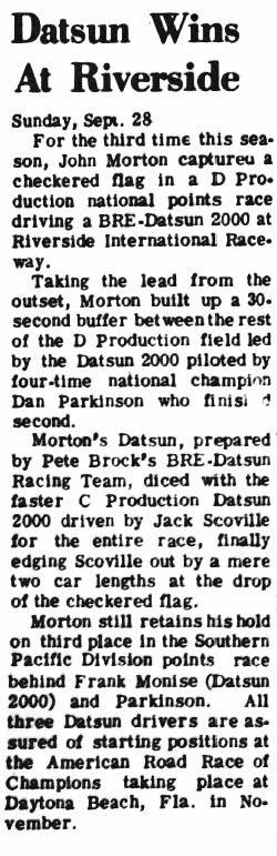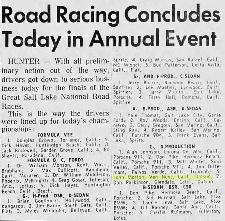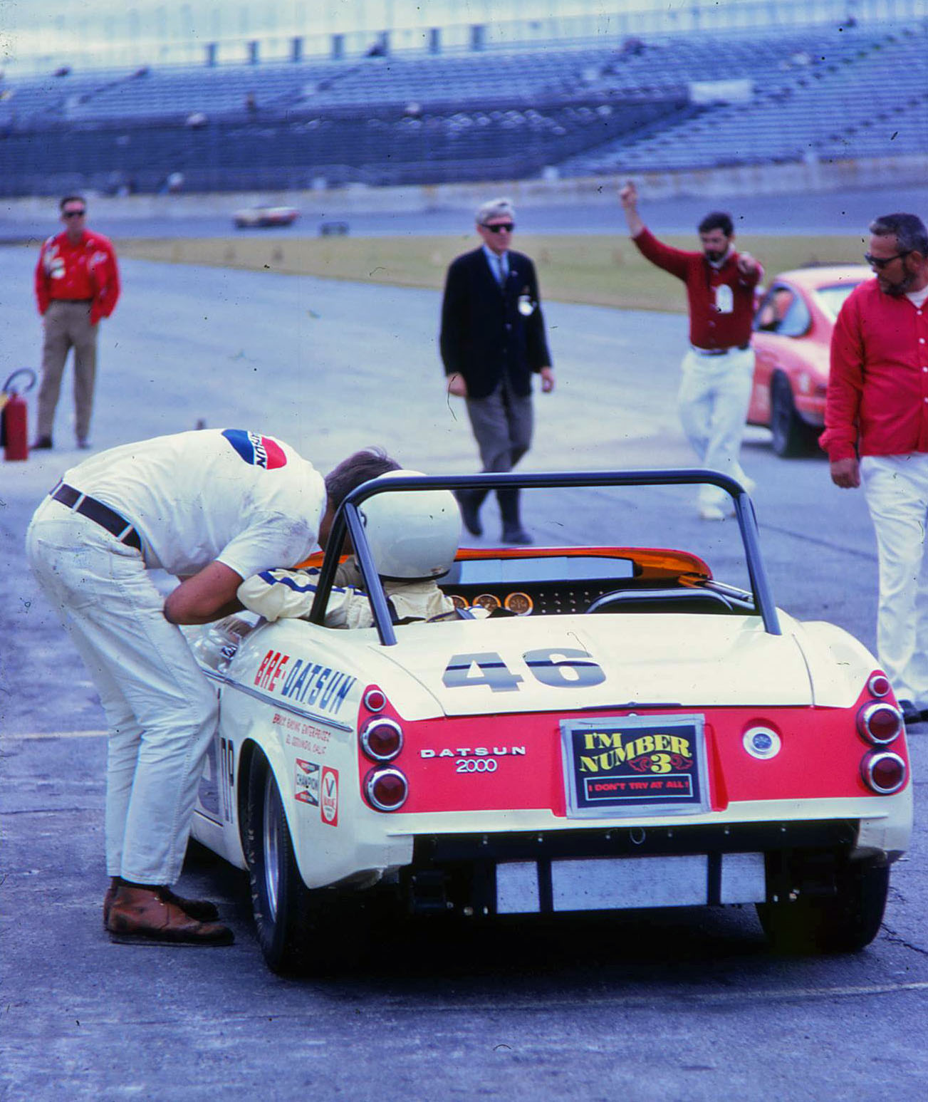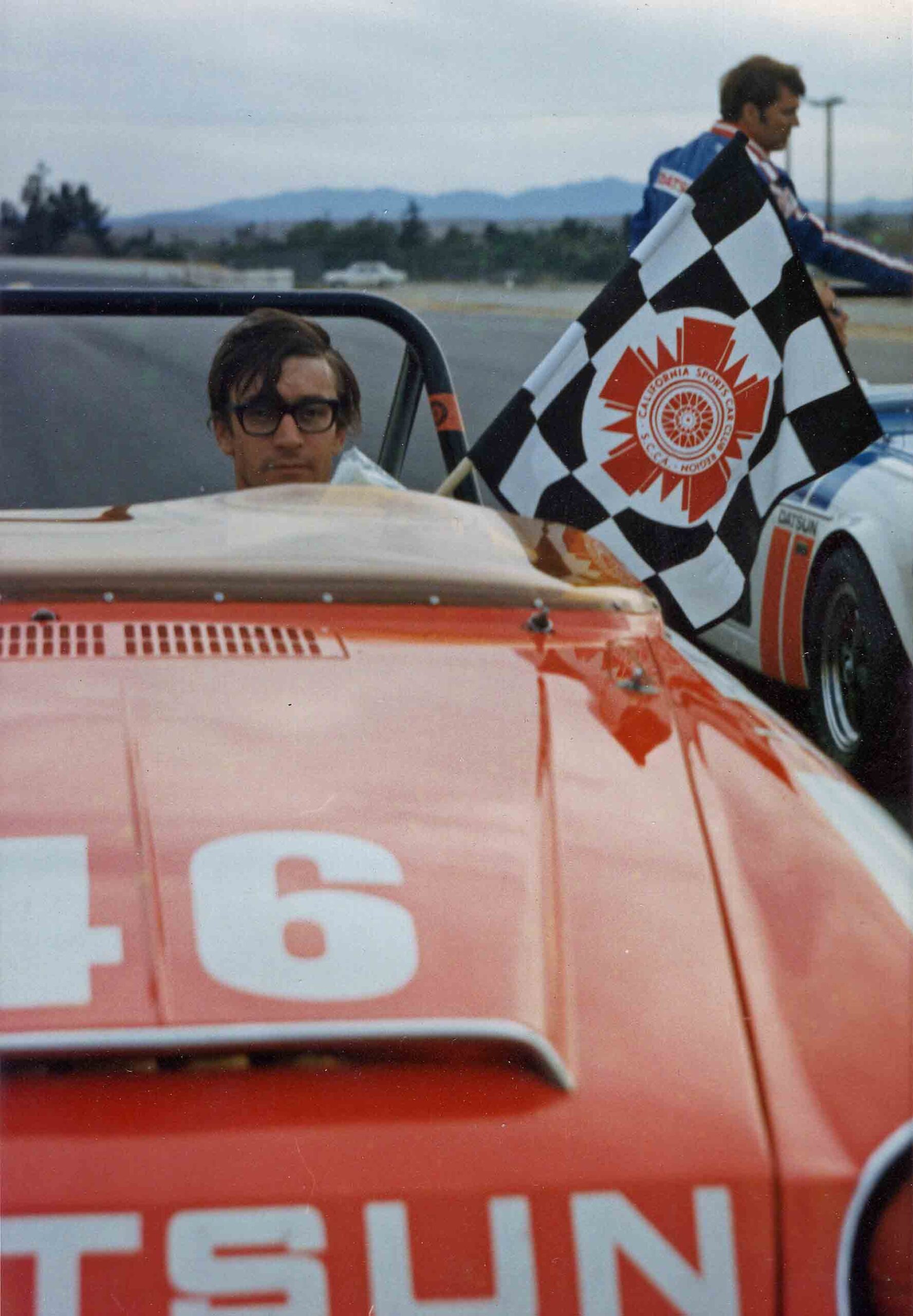 “It was late ’68 when George Boskoff told me that two Datsun roadsters were delivered to BRE for the purpose of being prepared for racing. The driver was to be Frank Monise, a very experienced driver from Pasadena who had raced Lotuses for many years.