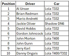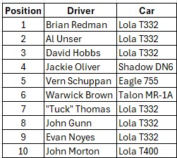 John again drove the #46 T332 where he qualified 7th, finished Heat One 4th and came home 12th in the final.