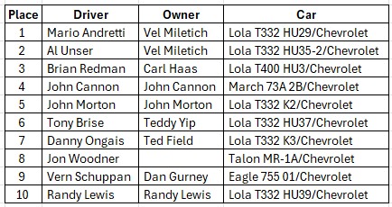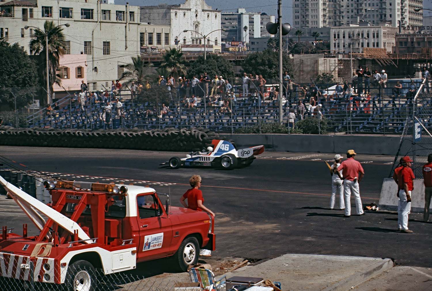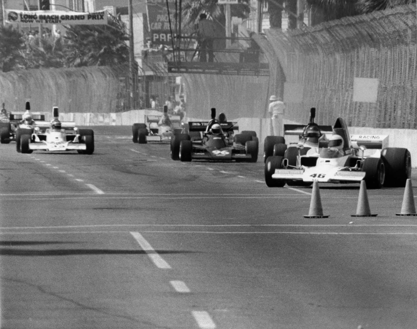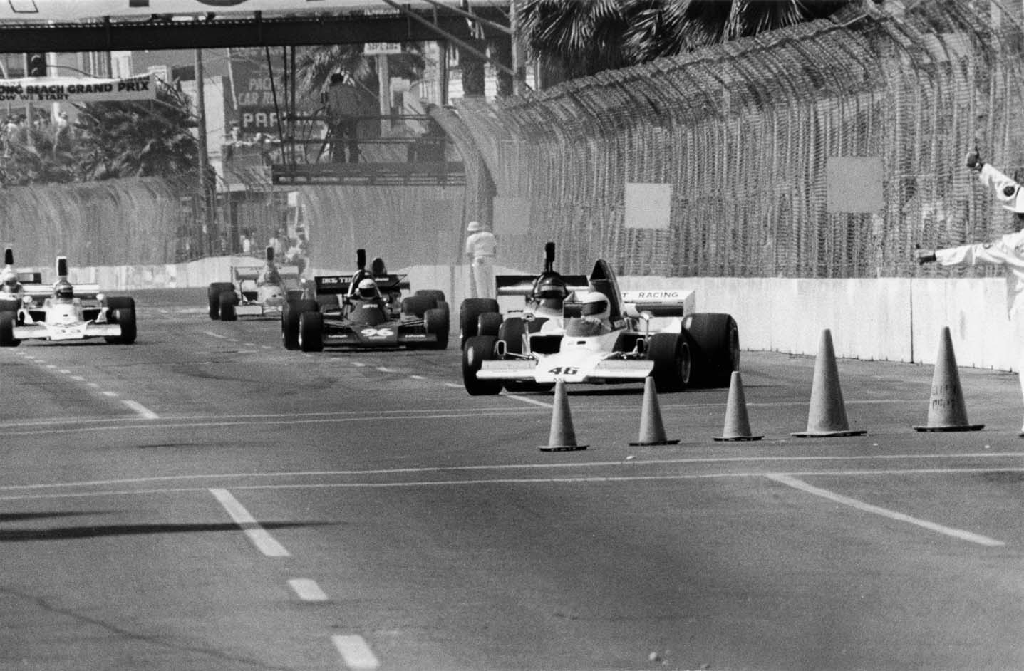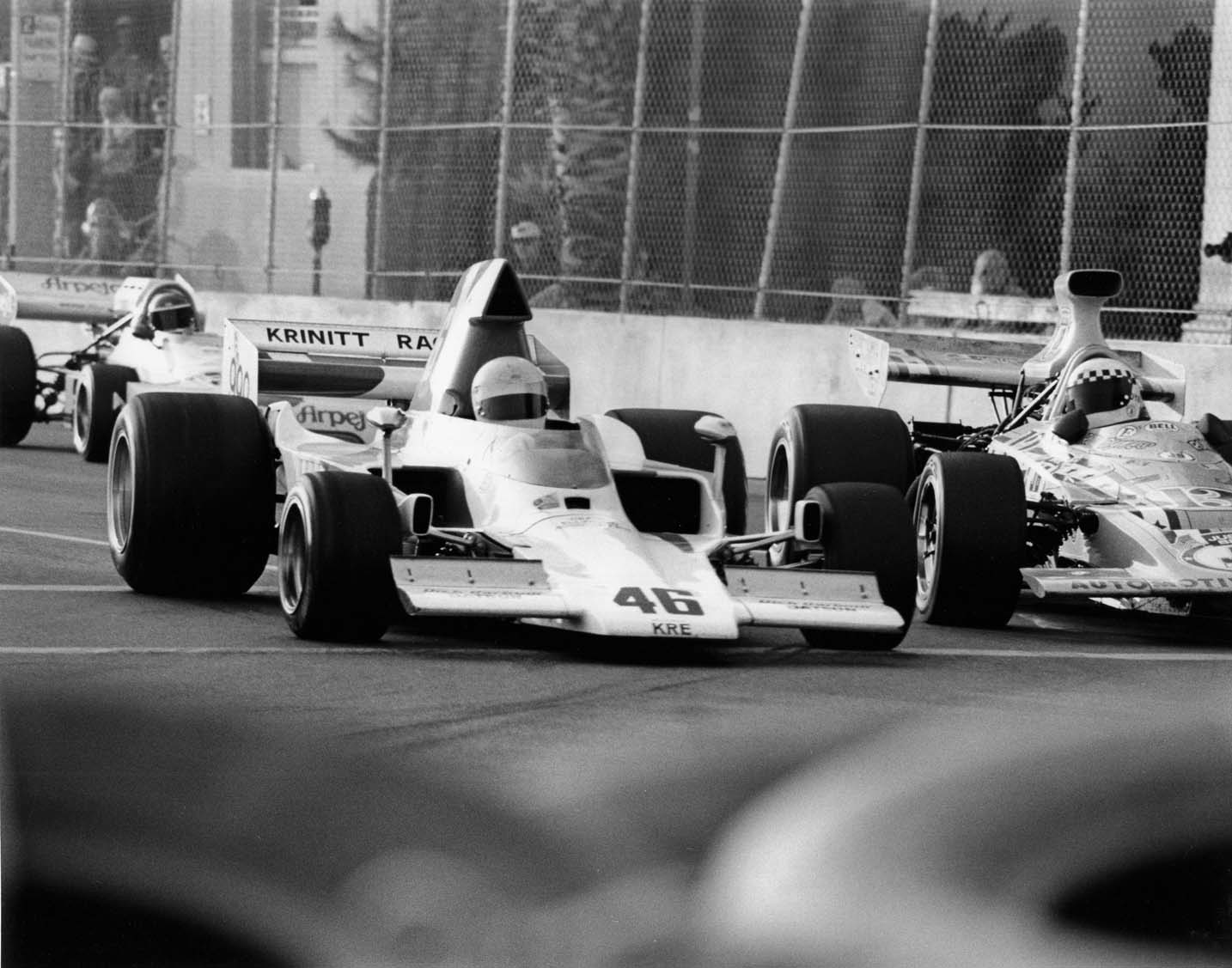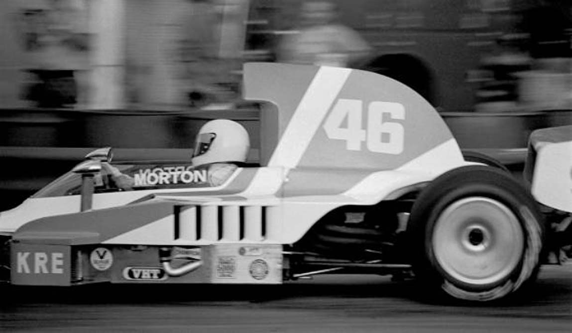 Krinitt Racing moved the engine, gearbox, wheels, instruments, brakes and steering rack from the T400 chassis to a T332 for the inaugural Long Beach Grand Prix. John finished 9th in the race.