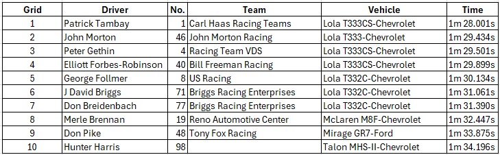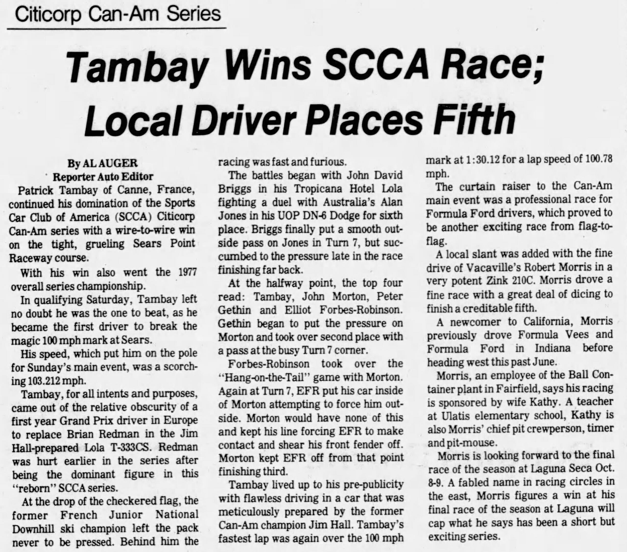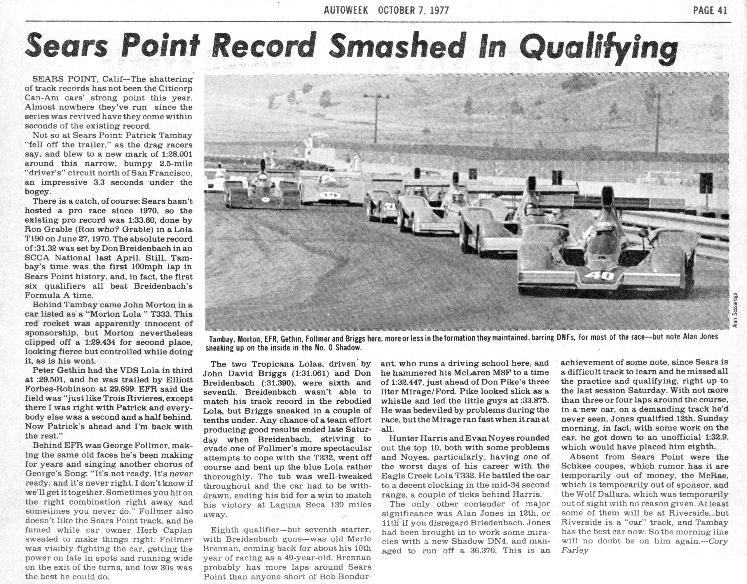 John put his Lola on the front row at Sears Point beside Patrick Tambay’s factory entry, still preparing the car himself. That feat — racing a professional series without a paid team to take care of the car — could not be duplicated in today’s professional racing.