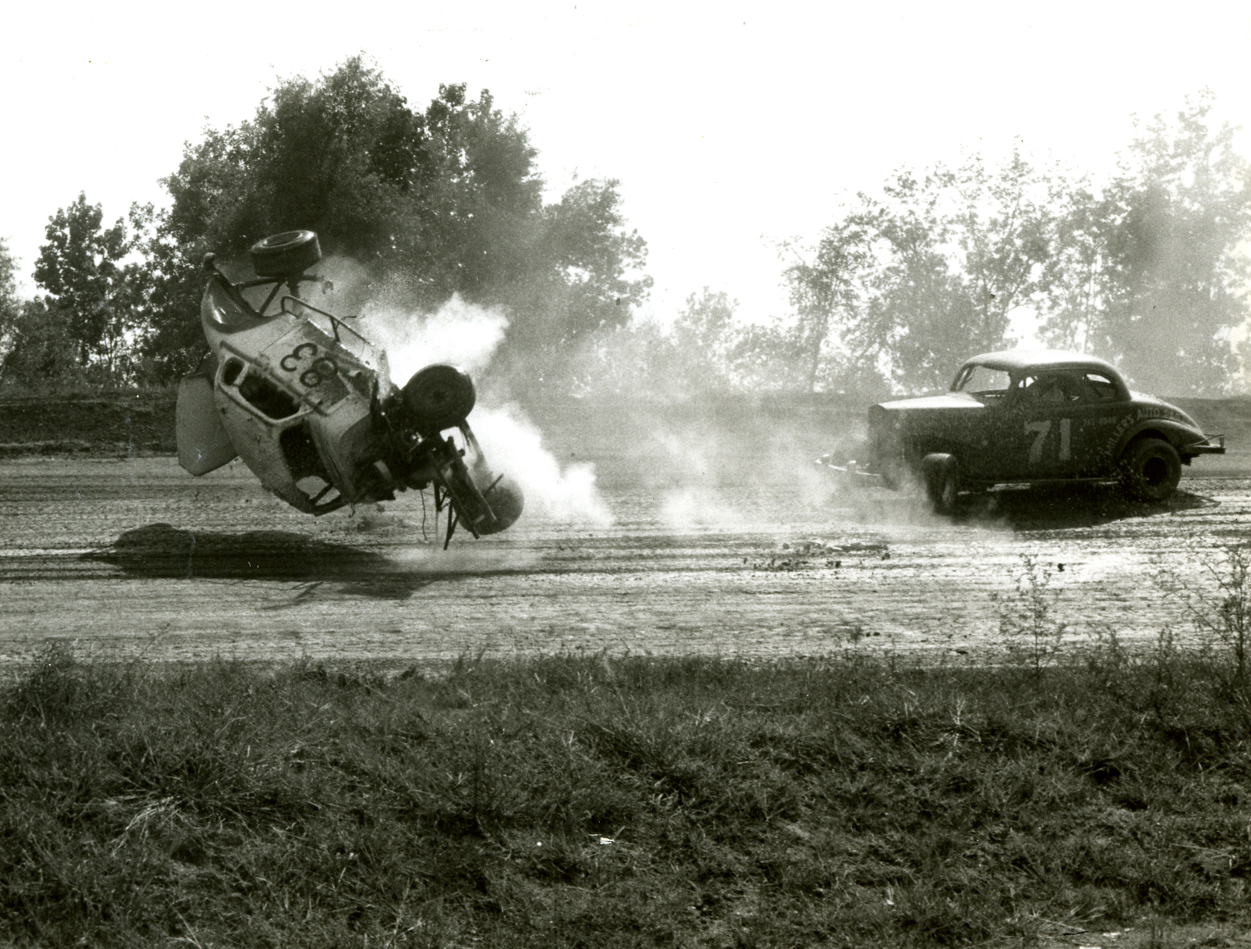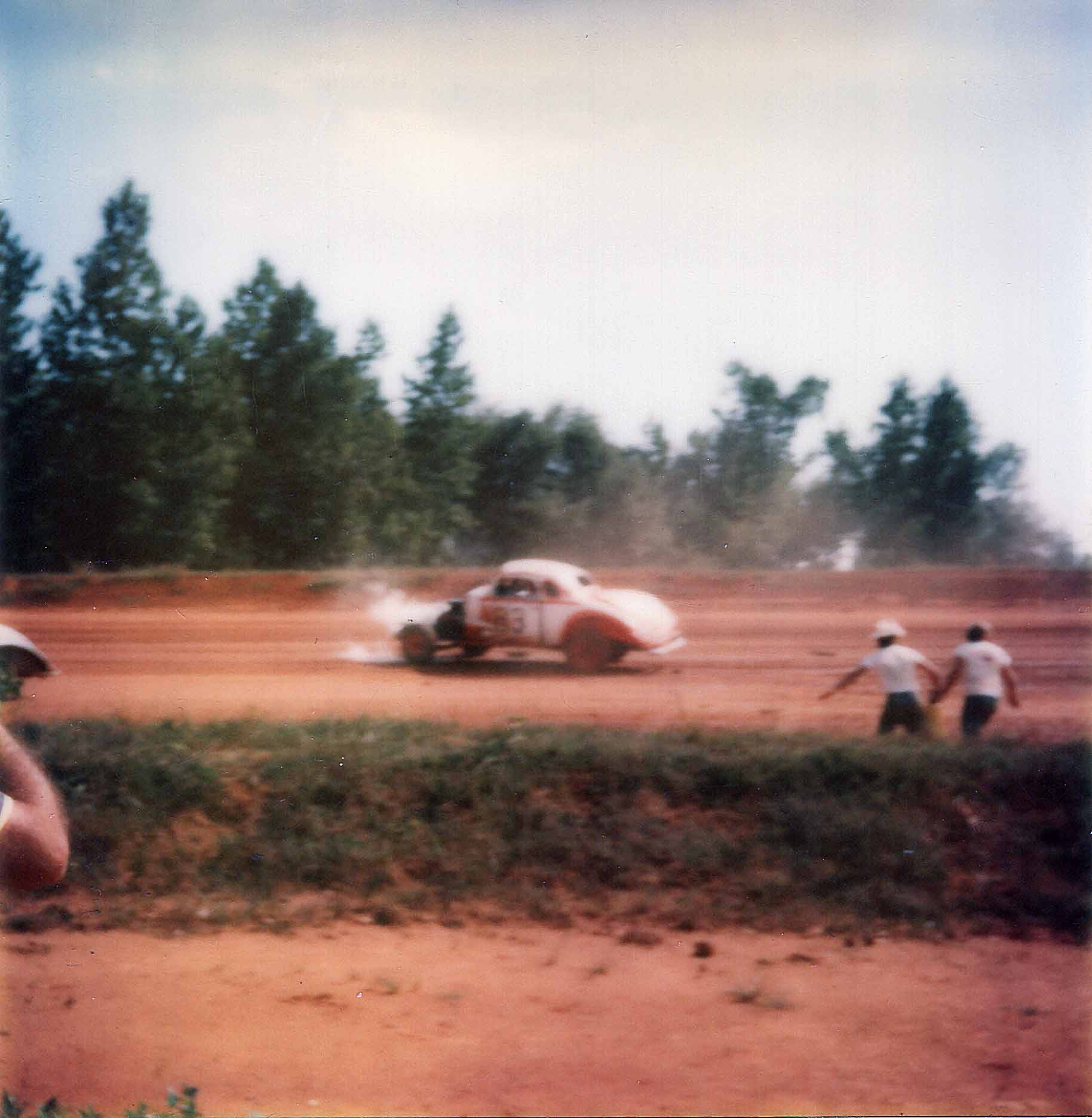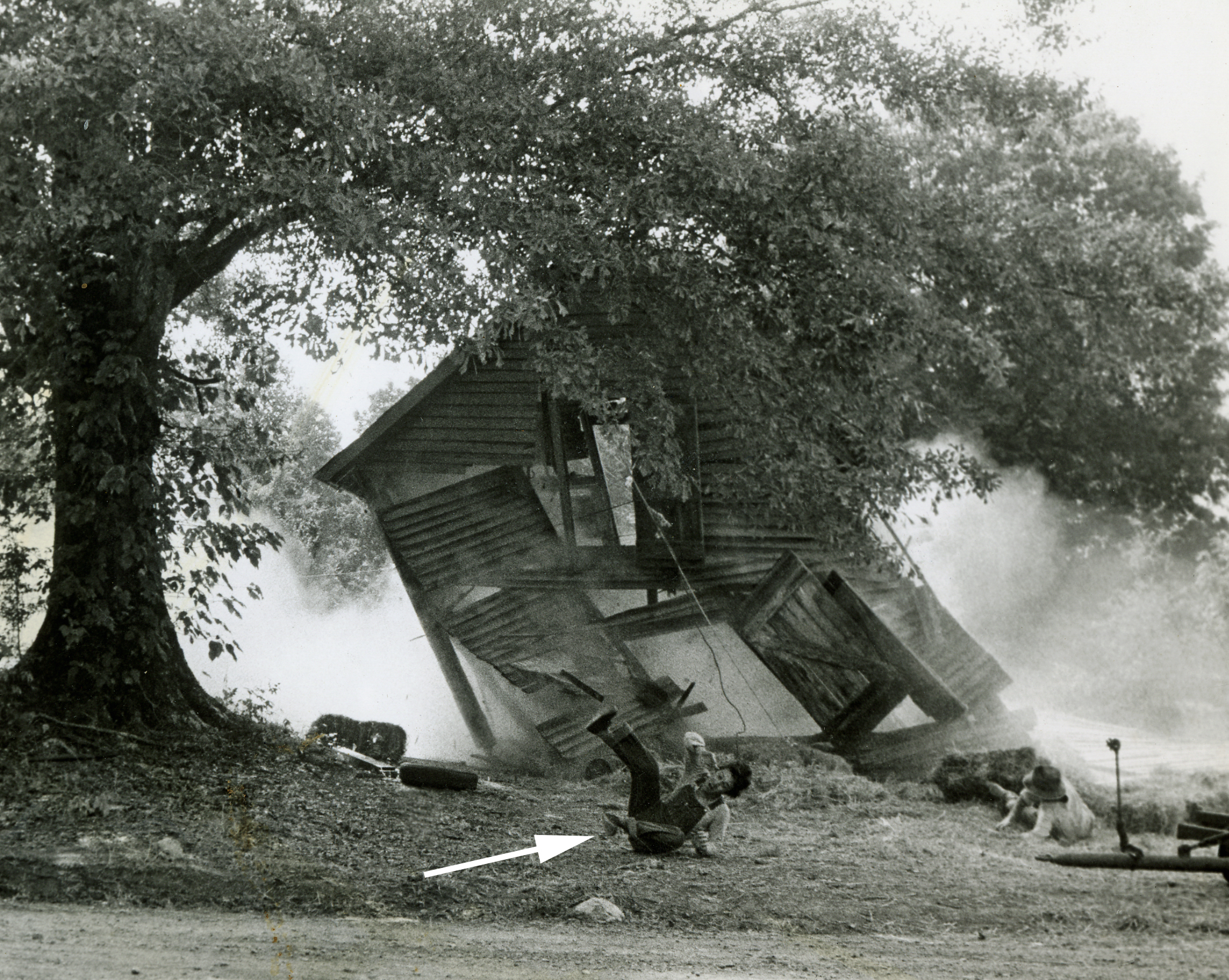 John: “Every stunt guy on Greased Lightning got one big one to do because the big ones paid the big money. The cannon, where they rig gunpowder to blow a driver-activated telephone pole down a tube to the ground at an angle, rolls the car multiple times depending on the size of the charge. It was the only stunt left that nobody wanted to do, so I did it. The first time nothing happened when I pushed the button because nobody connected the wires to the battery. I had to get my nerve up all over again. The second time it went big and I rolled it six or seven times down the middle of the track. I had a headache for two days.”