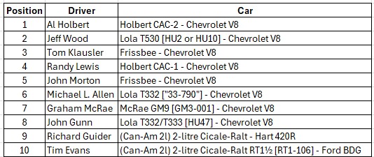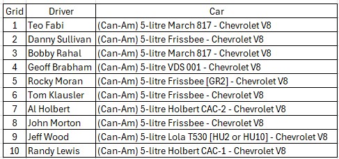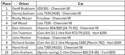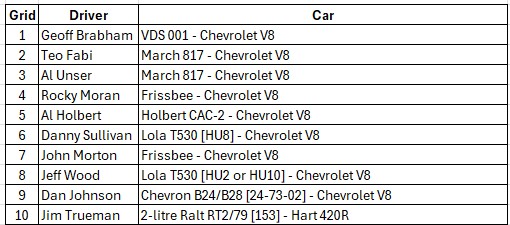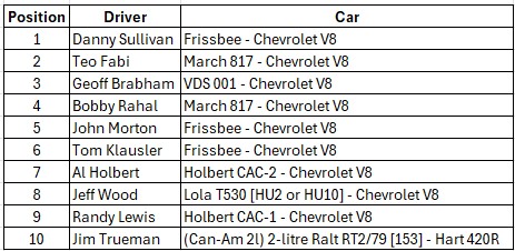 John was originally scheduled to drive a Vasek Polak Porsche 935 in this race, but the engine failed during practice. BMW then asked him to sign on as a reserve driver for their March BMW M1/C driven by David Hobbs and Marc Surer, but John did not drive the car.