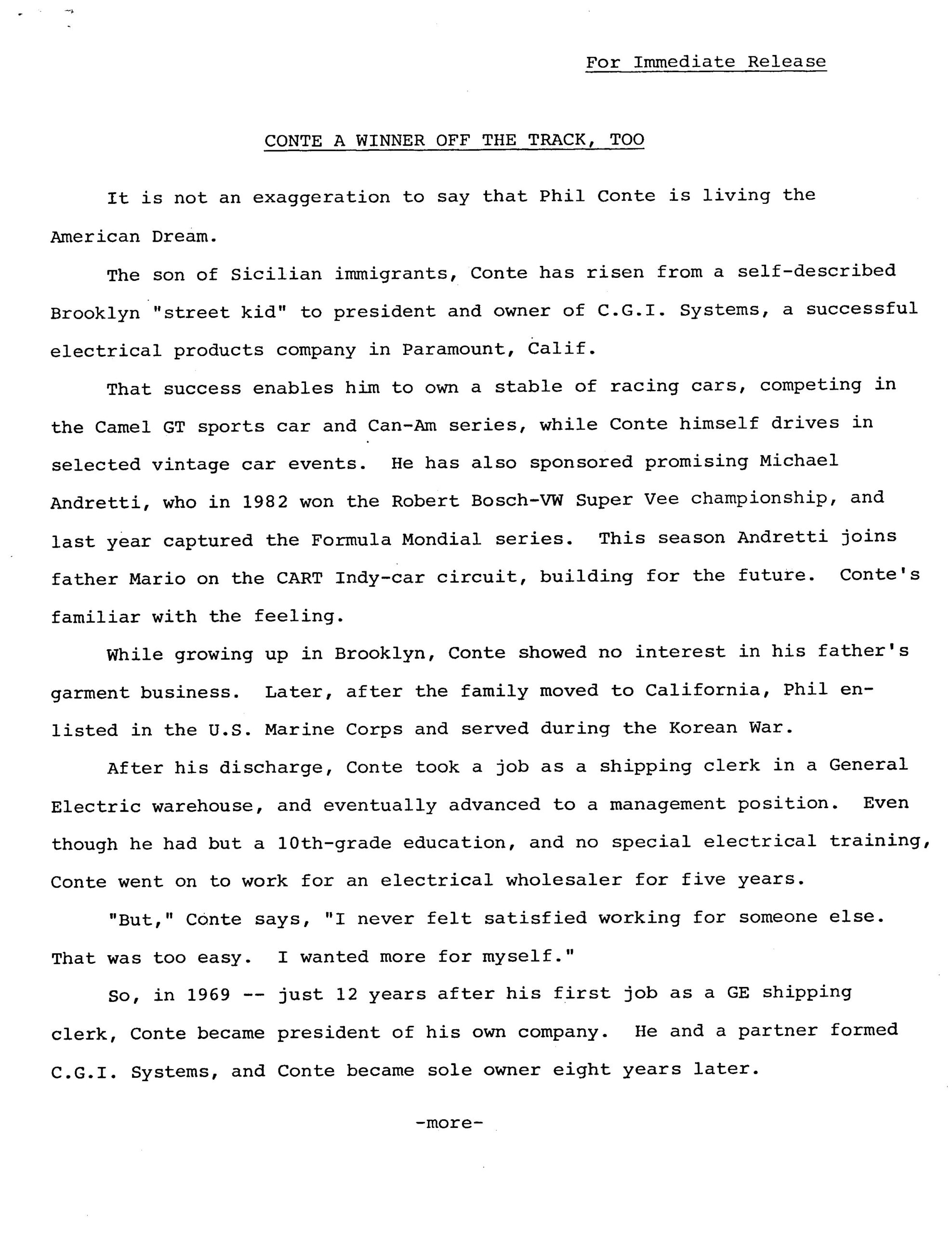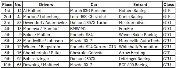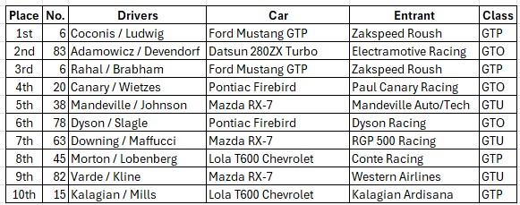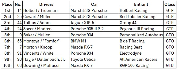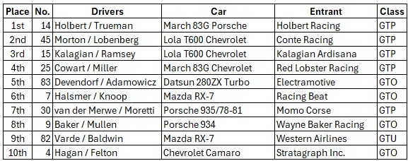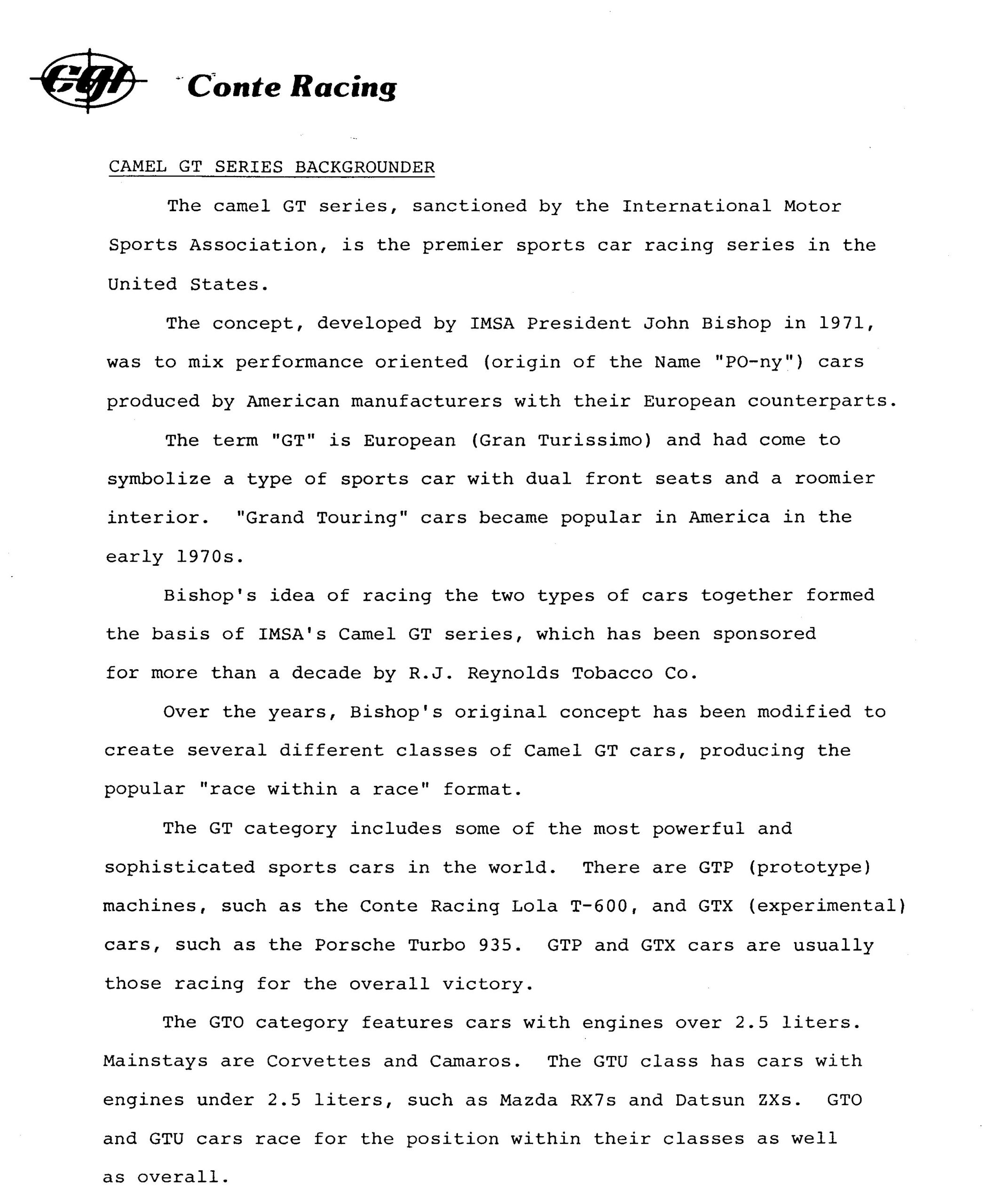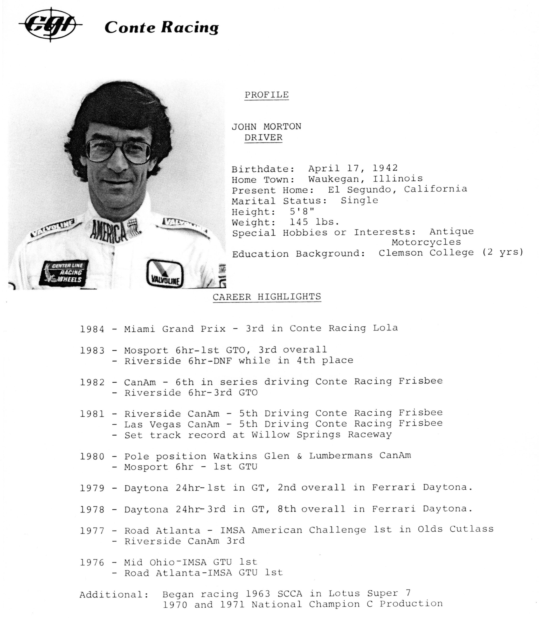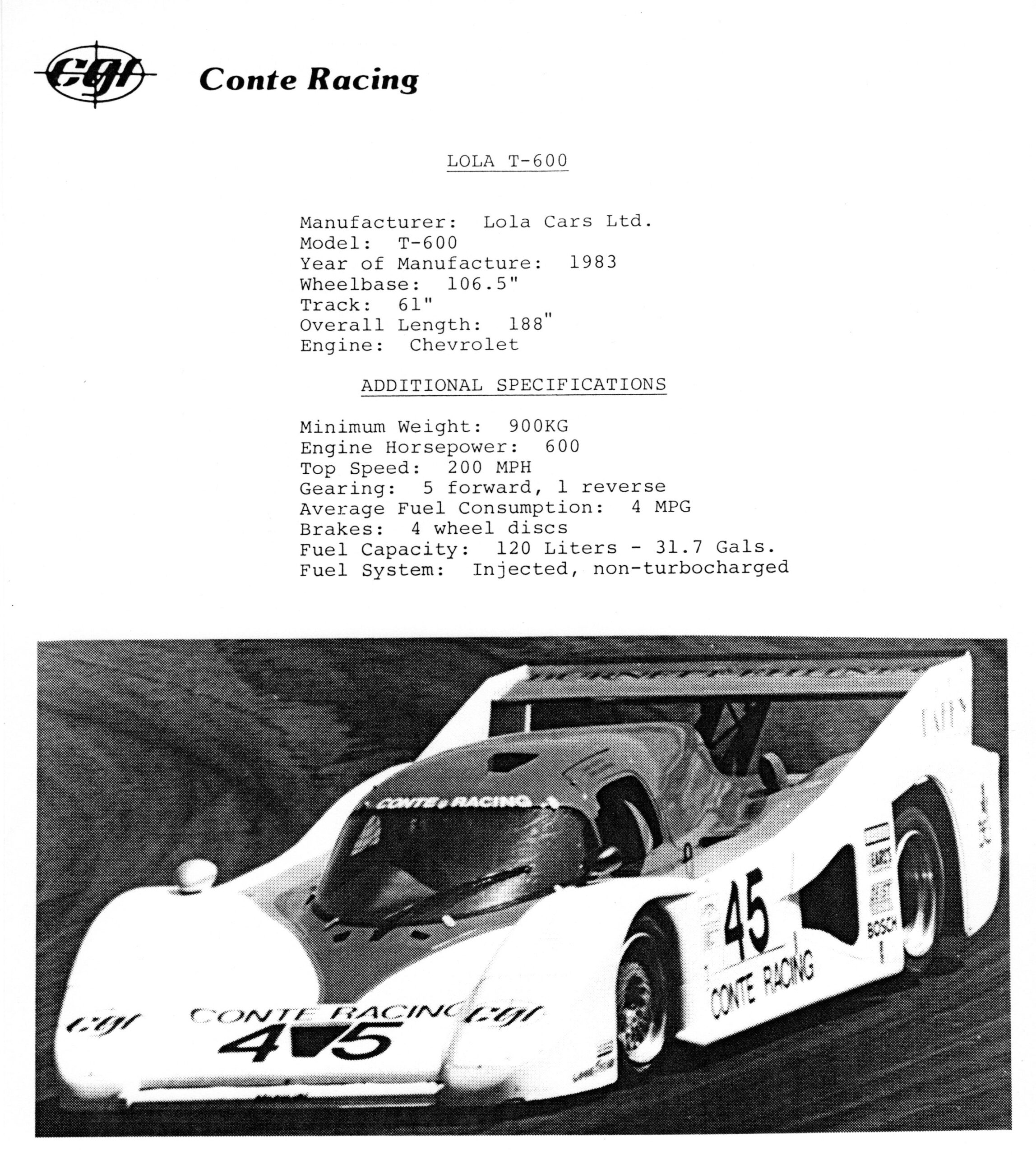 The Conte Racing IMSA GTP Lola T600, on pole at Sears Point Raceway, was driven by Morton and Bob Lobenberg to second place. The car was soon made obsolete by the Porsche 962 which would dominate from 1985-1987.