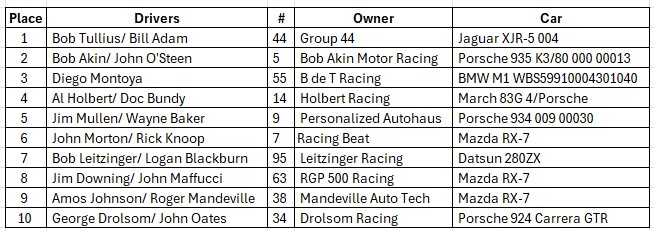 “The Mazda was an underpowered car in the GTO class against cars like Gene Felton’s Camaro and Craig Fisher’s Firebird. Jim Mederer of Racing Beat told us: ‘The only way to win this one is to run every lap like a qualifying lap. Those other guys have too much power for us. I believe the car will hold together so go flat out for six hours.’ So that is what we did and we won and finished third overall.”