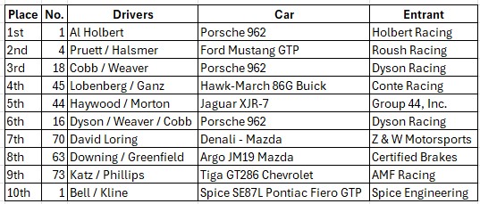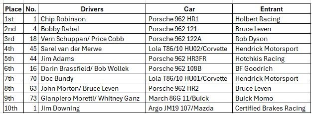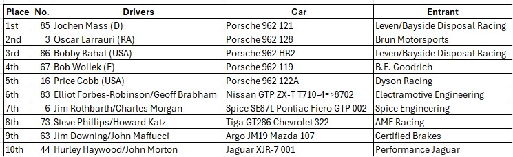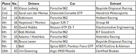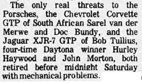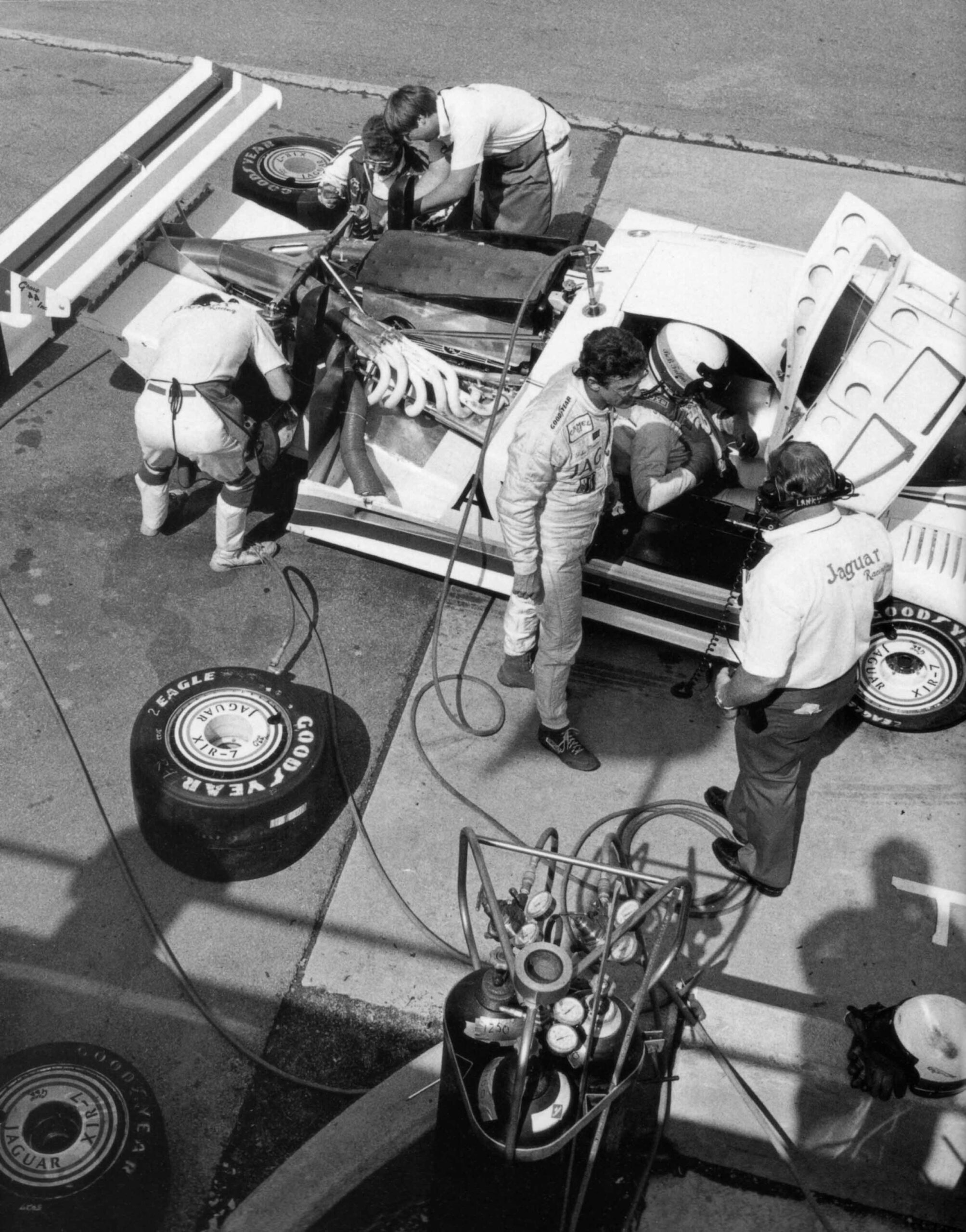 As John was exiting the pits at night, his safety belts came loose. He then recalled an incident in 1964 at Road America where Skip Scott pitted to reattach his safety belts which had come loose while he was driving. The crew was very critical of Skip for pitting for such a “trivial reason.” John ended up driving the one-hour stint in the GTP Jaguar with disconnected belts.