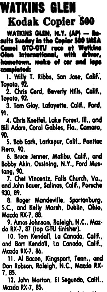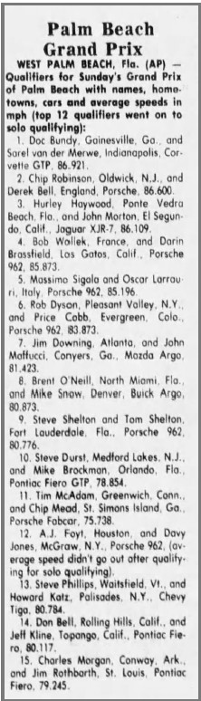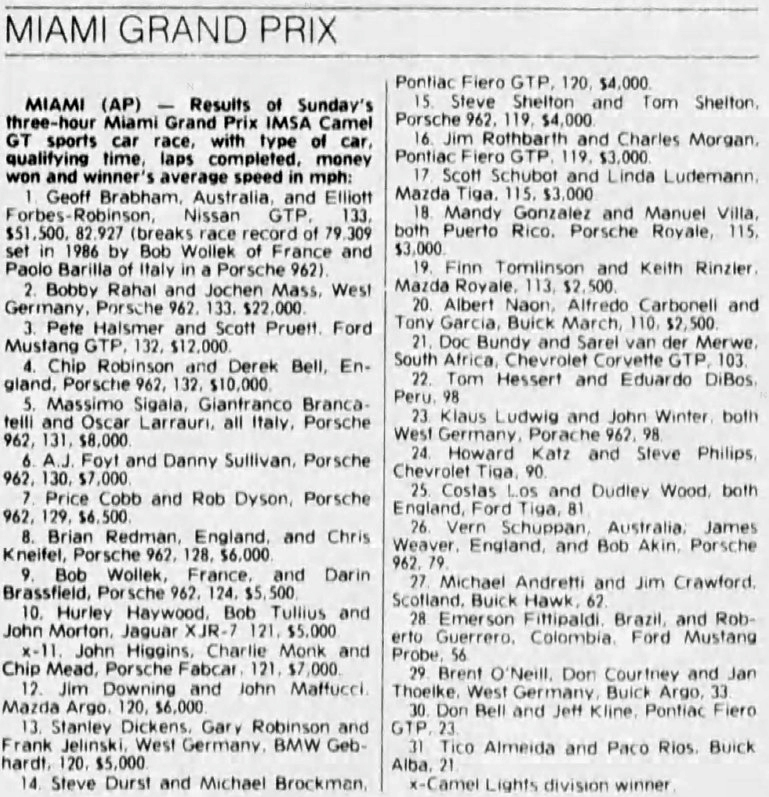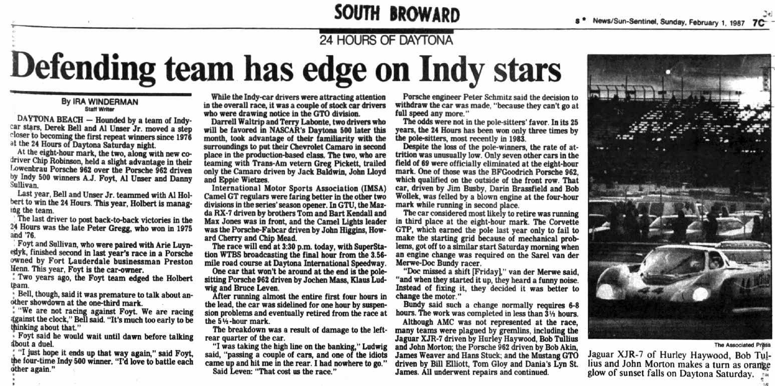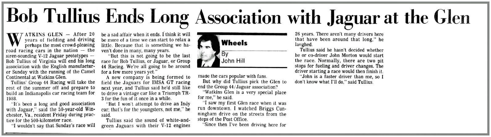 “In 1987, Bob Tullius took out a new Jaguar XJR-7 at Riverside for a test, lapping faster than Hurley and I had gone all day. Too fast actually, destroying it at Turn 2. I needed to go in the semi. I waited and waited, thinking how embarrassed he must be. Finally I went in and there was Bob, a beer in his hand, his girlfriend icing his leg and he said: ‘I guess I showed you young guys how it’s done.’ And he was serious.”