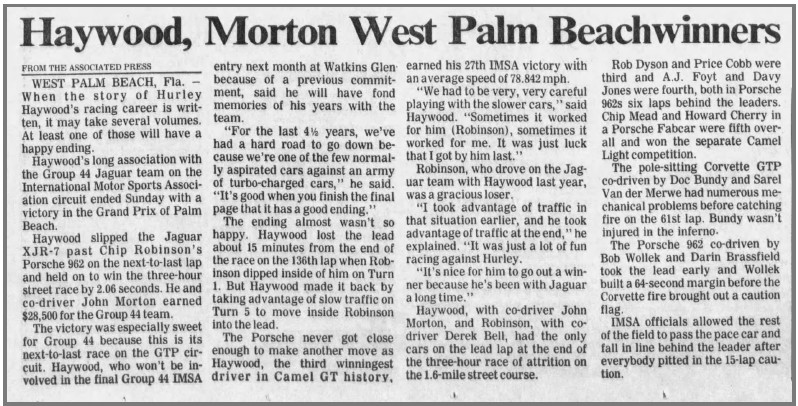 John drove in the Group 44 Jaguar, winning the last professional race at the doomed Riverside track in 1987. “That was a special win for me in another way because that is where my career started, at the Shelby School at Riverside in 1962.”